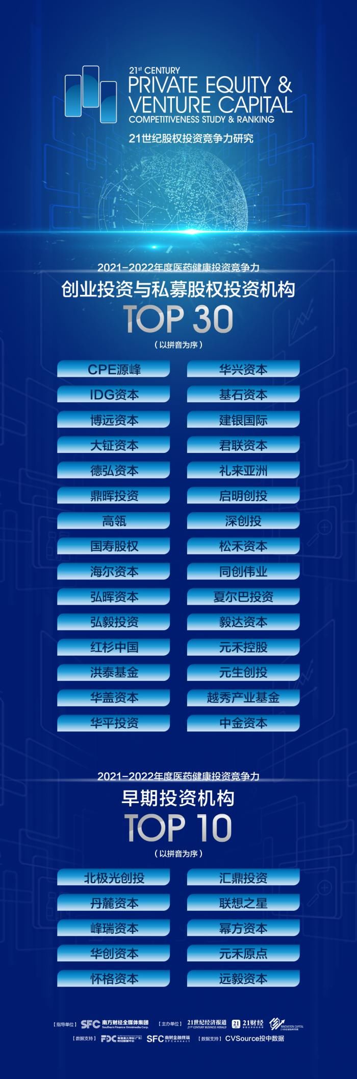 在以医药健康投资作为重点关注方向的诸多投资机构中,21世纪经济报道、21世纪创投研究院通过对数百家投资机构的调研、走访与问卷发放,收集各基金募资,医药健康领域投资、退出,及被投项目的后续轮融资等业绩表现,同时参考第三方机构CVSource投中数据的数据,再结合行业专家评委会对拟上榜机构在ESG等方面的考量,“2021-2022年度医药健康领域投资竞争力研究案例”由此新鲜出炉。下位具体榜单: